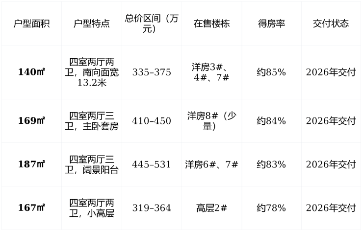 温馨提示140–187㎡洋房是主力 ,户型稀缺,建议优先锁定南向、高楼层房源;高层167㎡适合预算有限但追求地铁通勤的家庭。