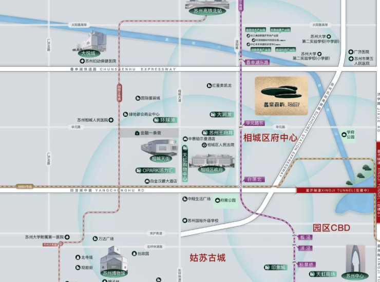 西南面有苏州王府井购物中心和天虹购物中心,天虹对面正在建设的相城天街。