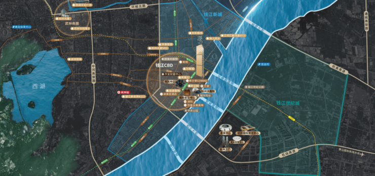 人文之湾为杭州大剧院、城市阳台、市民中心、堪比林肯广场,枢纽之湾为市心3轨4桥3隧道、7大高速,辐射长三角
