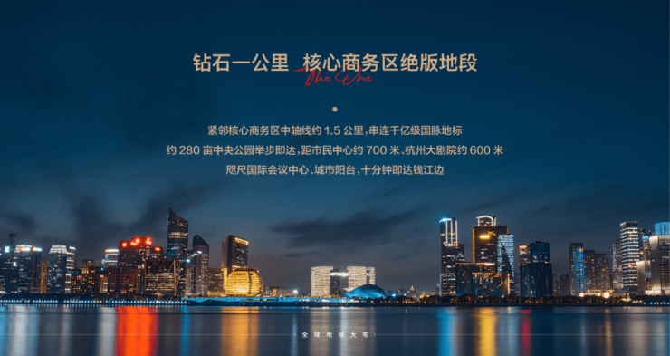 位于杭州市江干区钱江新城核心地段、2号线、4号线地铁口、配套公园之湾约280亩中央公园比肩海德公园