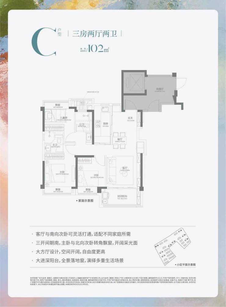 102㎡三房两卫:边户270°转角采光,主卧套房带独立卫浴,U型厨房操作台长4.8米