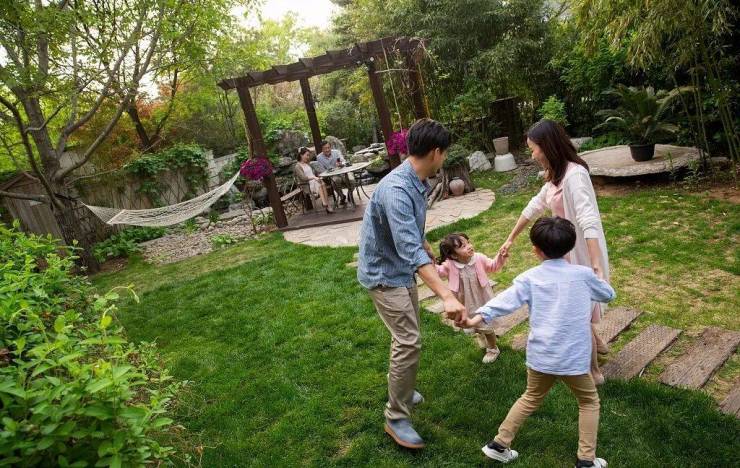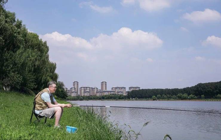 长者湖边垂钓,草坪上孩子们欢乐奔跑