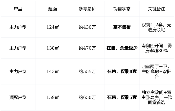 参考均价:34,500–34,800元/㎡ ,总价区间 430万–650万元 ,159㎡大户型含独立家政间,为稀缺收官席位。