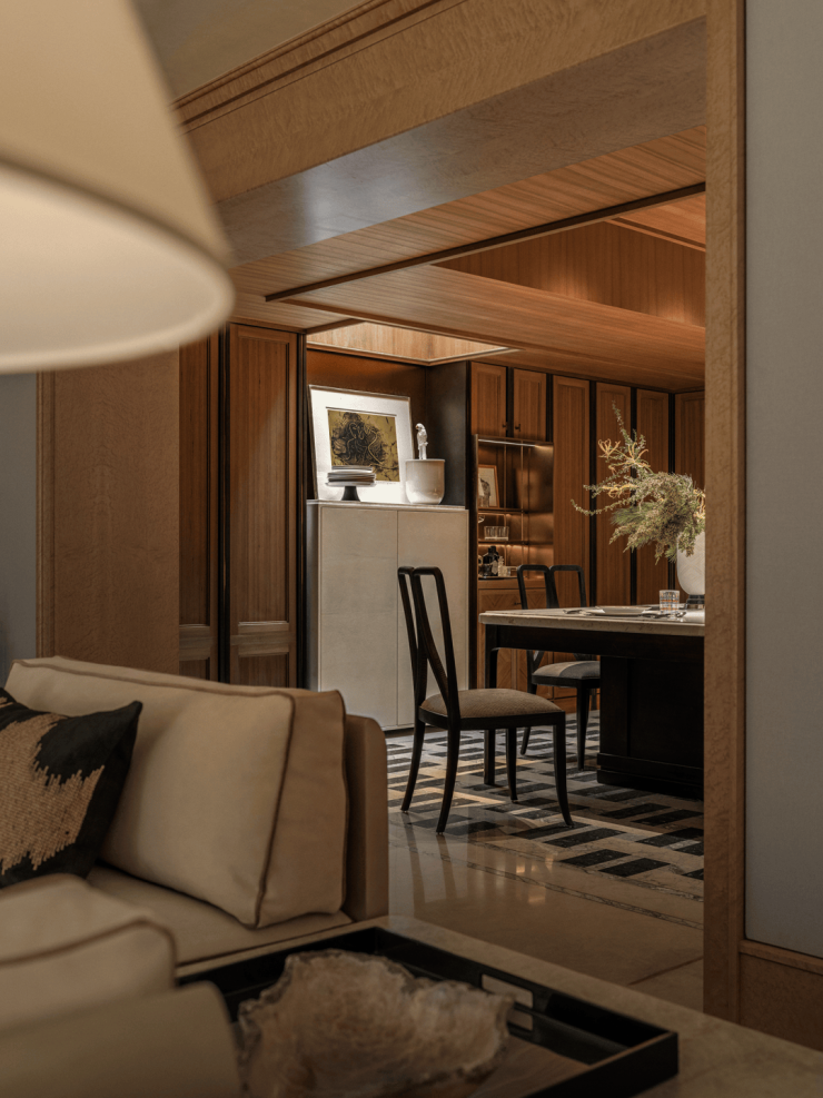 客餐厅之间设置了一道可灵活推拉的隔断门,使相邻的功能空间在闭合的独立性与开放的流动性之间自由转换,适应不同的使用场景与生活时刻。