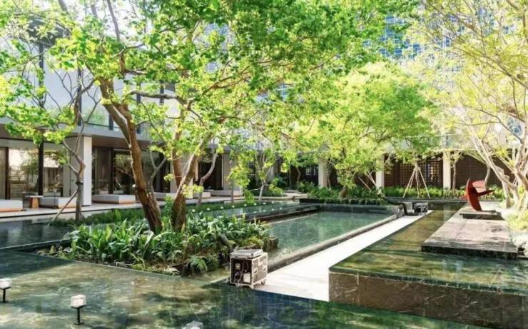 园林设计融合东方美学,连廊、光影、水景营造“生于山林、安于野”的度假氛围