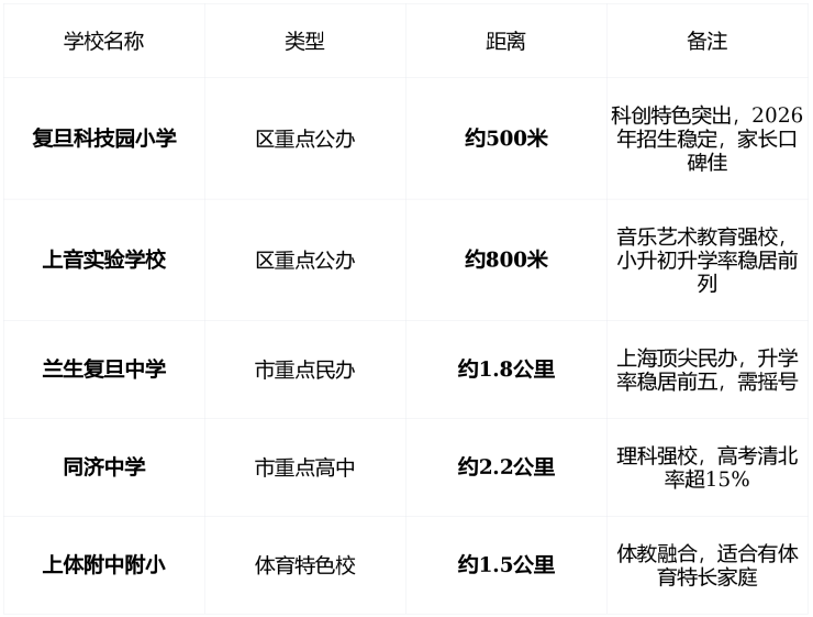 关键提示 : 项目无新建对口校 , 学区划片以教育局当年公布为准 ,但 复旦科技园小学+上音实验学校 为 步行可达 的 真实优质资源 , 非“画饼” 。