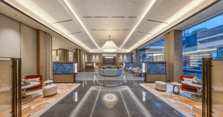 会馆的负一楼,能看到的所有陈设,像花瓶造型的吧台、专门定制的灯具都有着浓烈的苏州之美,也完全感受不到这里是负一楼,“方塘观鱼”豁然入目。