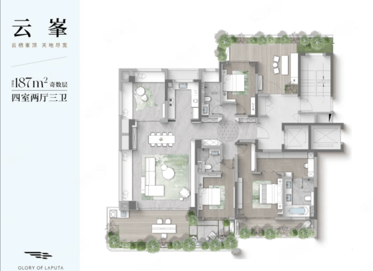 187㎡云峯 | 四室两厅三卫:总价待定,备案单价约27208元/㎡,顶层得房率130%