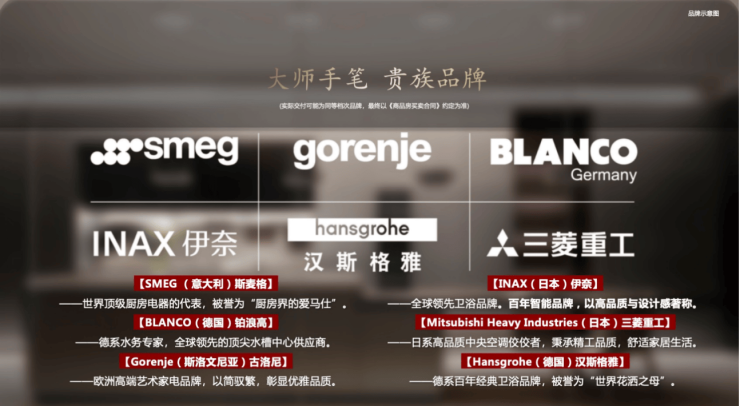 臻选SMEG/劳芬/古洛尼/伊奈/铂浪高/三菱重工/威能/汉斯格雅/杜拉维特等国际一线大牌(具体以商品房买卖合同为准),以至高规格的精装修标准,塑造高颜值、高配置、高舒适度的居住空间。