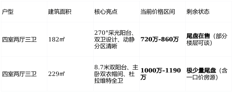 💡 价格参考 :备案均价 42,000–47,000元/㎡ ,实际成交价因楼层、朝向浮动,2025年Q4部分182㎡户型降价约20万元,229㎡户型因稀缺性价格稳中有升。