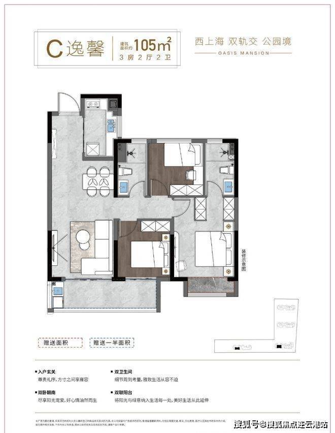 建面约102-106㎡:三室两厅两卫,三开间朝南,餐客一体连通阳台,总价160万-170万