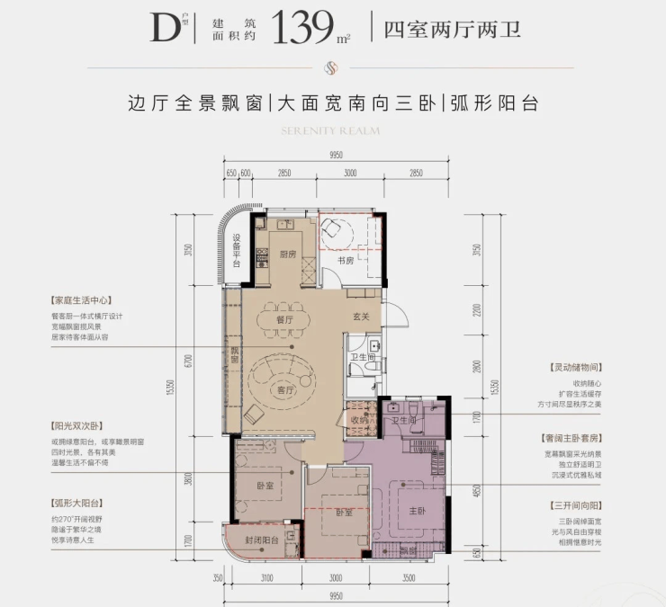 主力户型:建面约123㎡、128㎡、139㎡、173㎡,全四房设计,得房率高达87%-90%。