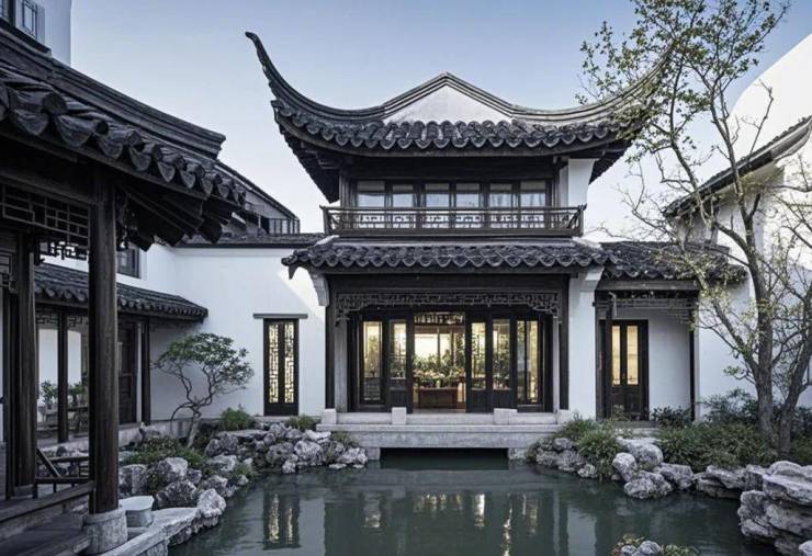 采用非遗香山帮工艺,包含太湖石假山、砖雕、廊亭等苏式元素