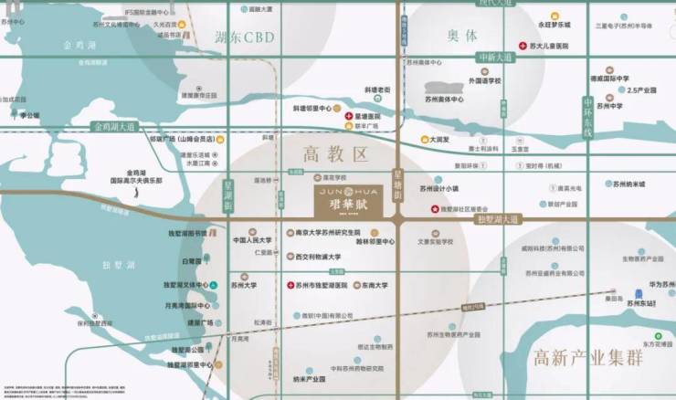 距独墅湖(直线约2公里)、白鹭园湿地(约23万㎡)咫尺之遥,毗邻法治文化公园、金鸡湖高尔夫等生态空间。