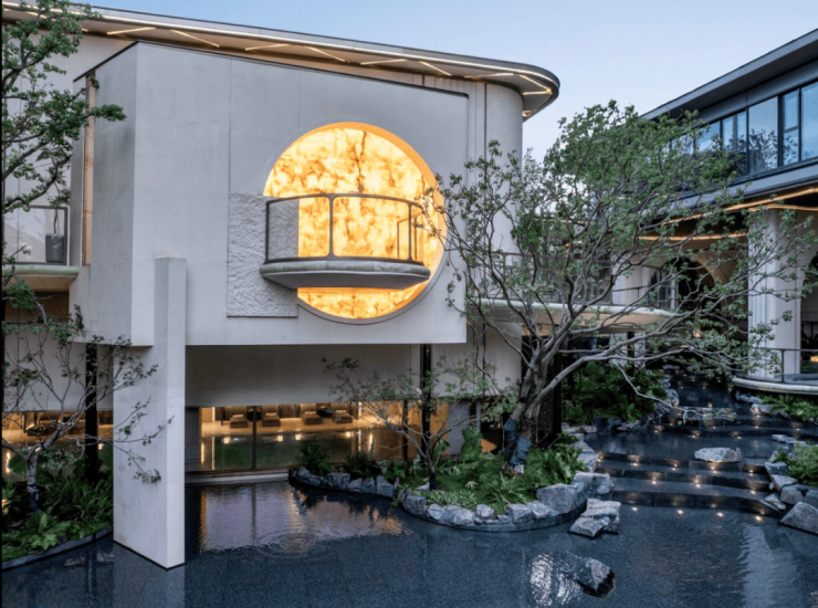 项目的接待厅里,玉石固然昂贵,但最动人的是窗外的树影。铜制雨链垂落,敲击台面,水滴沿阿富汗青玉而下至玄石端砚上,与室外的树影、风声遥相呼应。