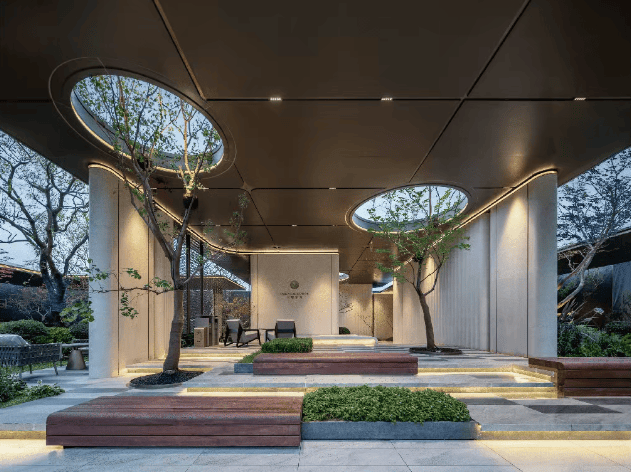 环视庭院时,你会看到掩映在茂林中的建筑。它们恣意地与连廊、树阵、花径融合在一起。