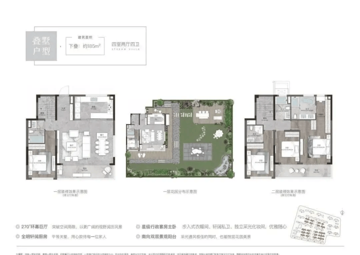容积率1.5–1.8的低密社区,规划44栋住宅,涵盖高层(105–120㎡)、**洋房(128–143㎡)与叠墅(172–235㎡)**三大产品线。高层得房率74%–80%,洋房80%–84%,叠墅87%–100%,空间利用率极高。叠墅采用四代设计,下叠赠送地下室,上叠配备双露台,满足终极改善需求。400 998 3632旭辉溪前雅居营销中心电话