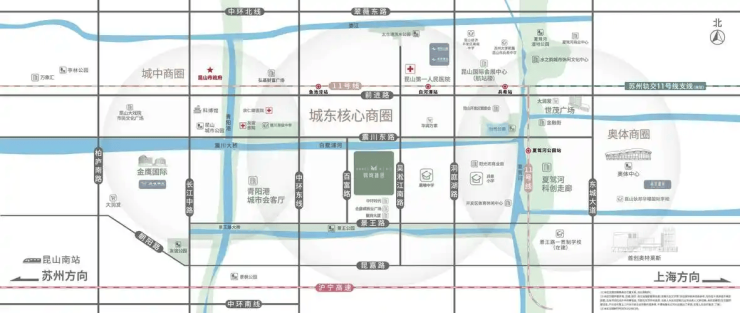 自驾出行:紧邻娄东路、吴淞江路、前进东路、中环东线等主干道,15min直达昆山主城,25min至苏州工业园区,50min至上海虹桥枢纽