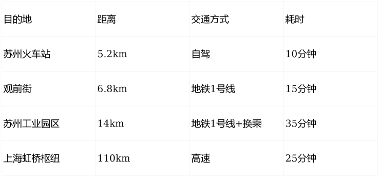 自驾:紧邻金门路、桐泾北路、西环高架三大城市主干道,5分钟车程接入北环快速路,10分钟抵达苏州火车站,25分钟直达上海虹桥枢纽。