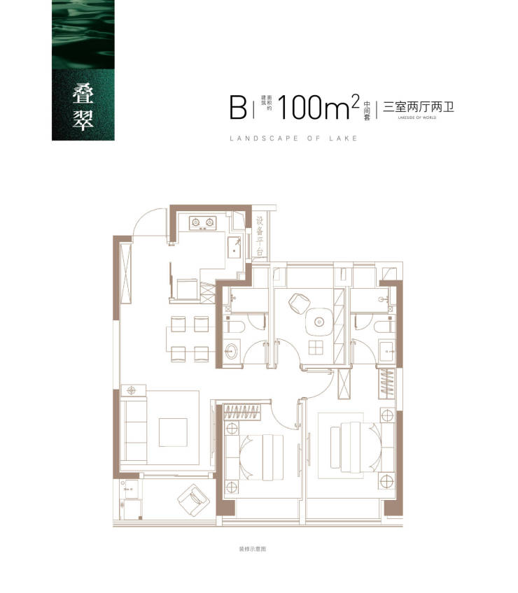 100㎡三房两厅两卫:南北通透+三开间朝南,客厅面宽5.4米,U型厨房动线优化,主卧套房设计