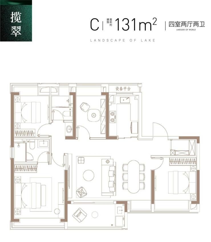 131㎡四房两厅三卫:四开间朝南,南北通透,主卧套房设计,全卧室带飘窗,卫生间干湿分离