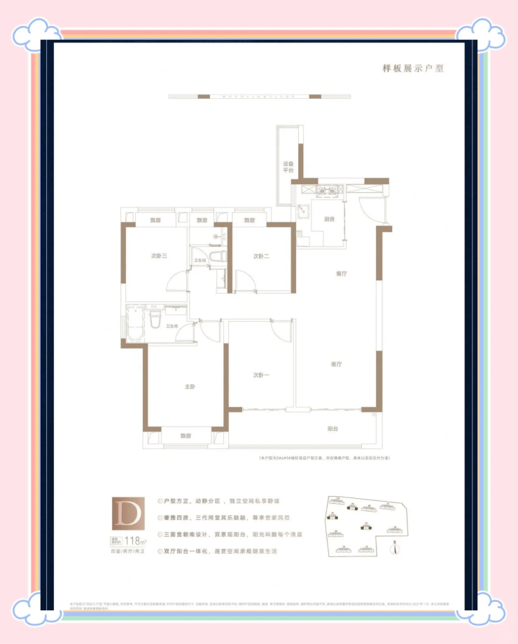 部分户型阳台面积赠送(如98㎡和118㎡户型阳台有一半面积赠送)