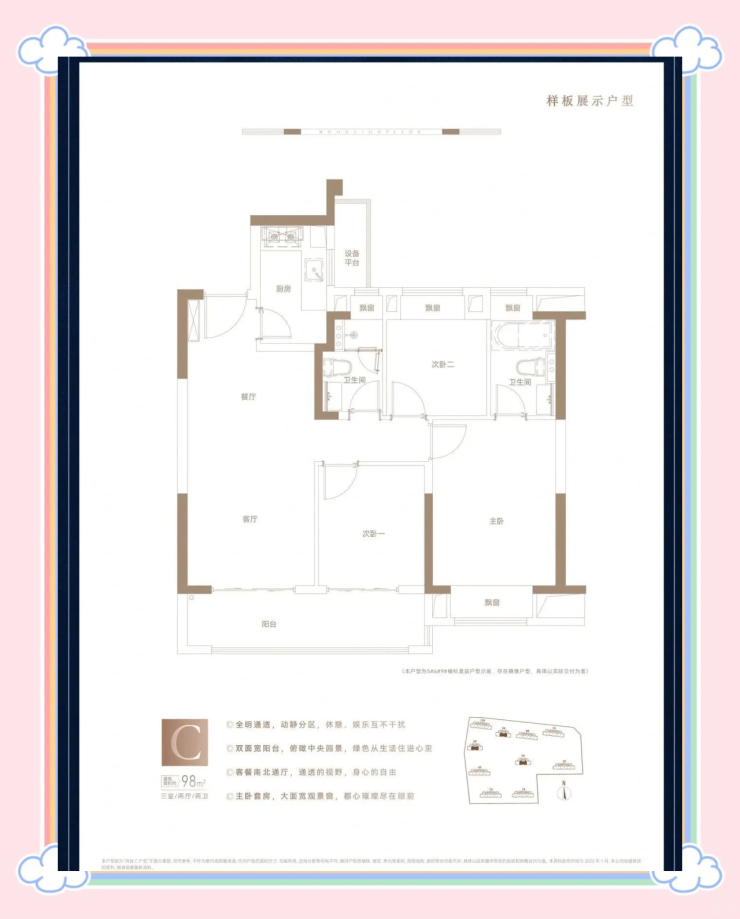 98㎡三房两卫:功能分区明确,主卧套房设计,改善型首选