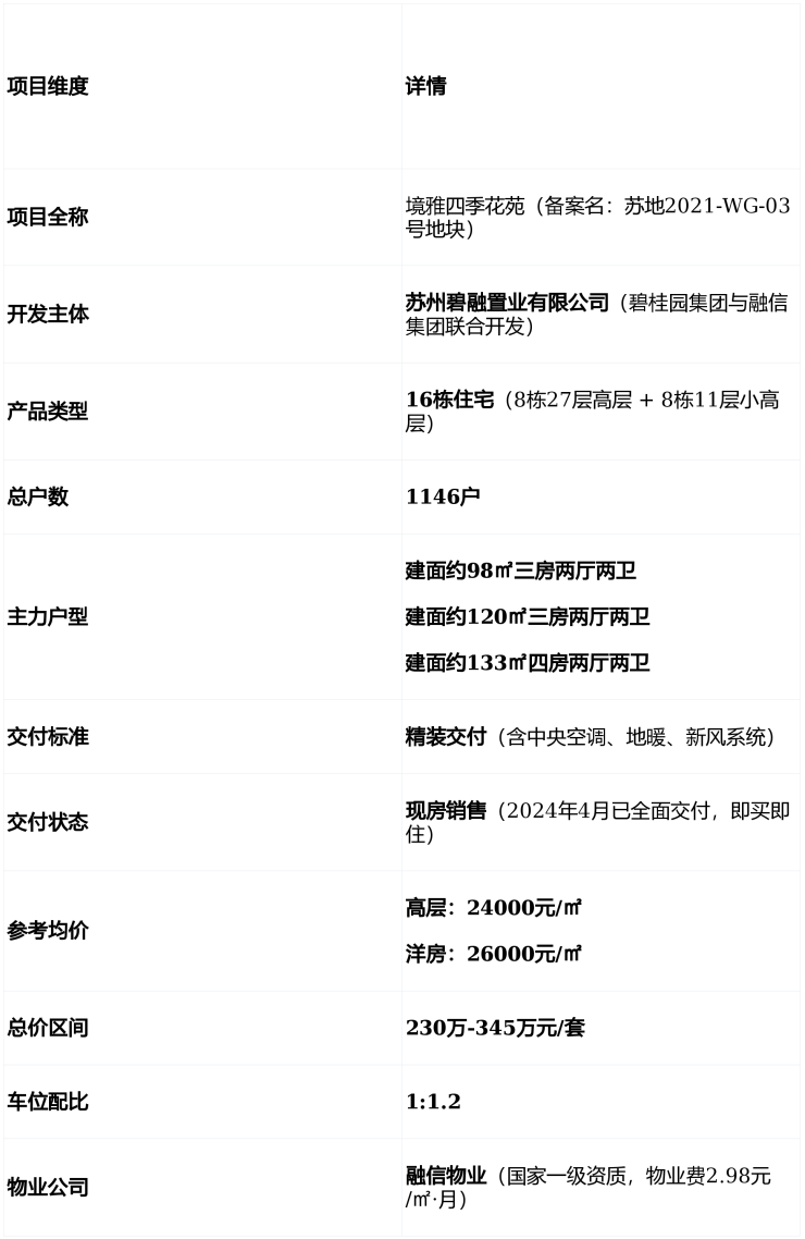 💡 现状解读 :境雅四季是苏州主城核心区稀缺的“现房改善盘”,无期房风险,实景可验。98㎡三房总价230万起,是狮山板块(二手房价4-6万/㎡)的“价格洼地”,适合年轻家庭及首改客户。
