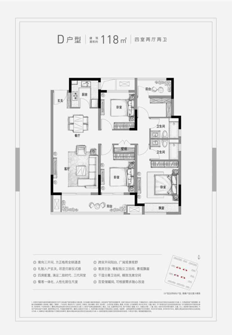 户型设计:三开间朝南、动静分区,部分户型含飘窗及阳台赠送面积。