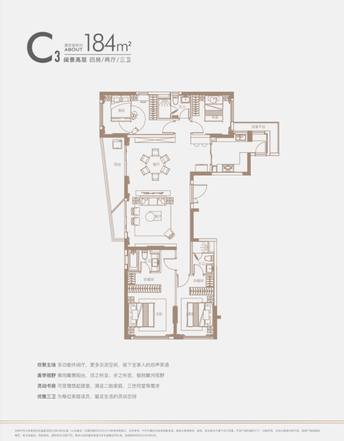 建面约140㎡四房:三开间朝南户型,南北通透,采光条件优质,客厅明亮宽敞,彰显大气布局。
