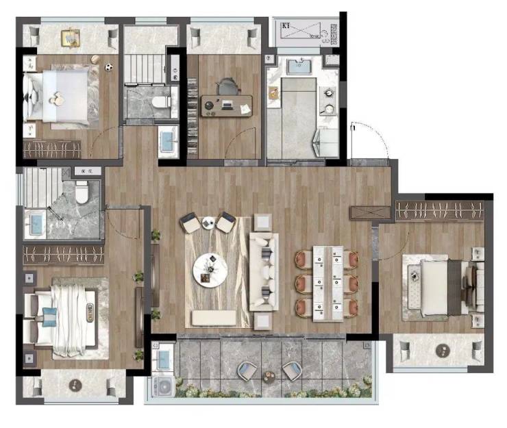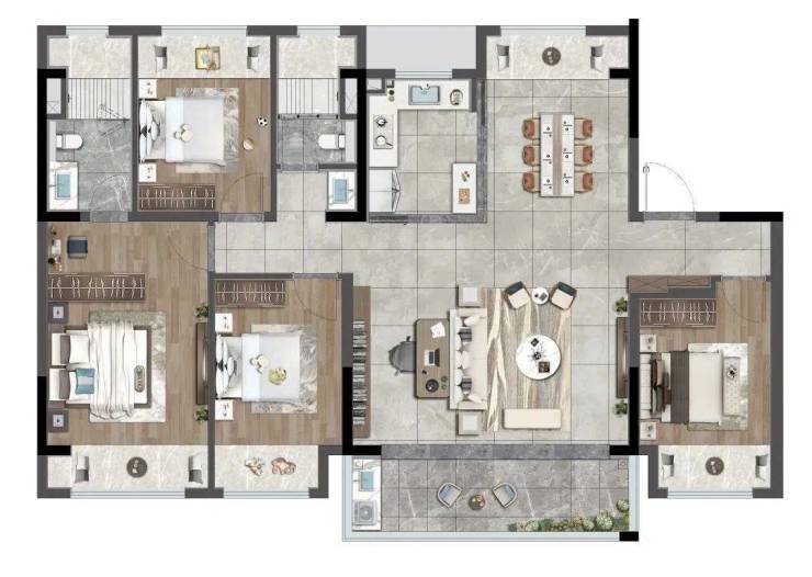 四居:129㎡(紧凑型)、134㎡(洋房专属,得房率72%)、143㎡(双套房)、173㎡(环幕视野)