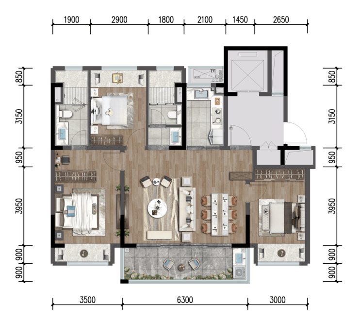 3. 创新户型设计:全横厅无连廊设计,空间开阔通透;全屋配备大飘窗,拓展视野与采光;引入华为全屋智能系统,开启便捷智慧生活。