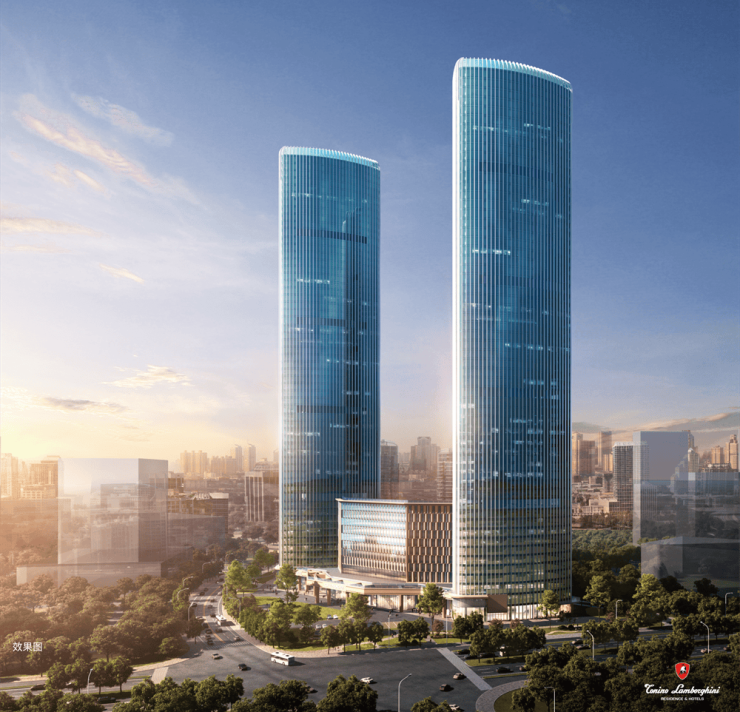 建筑规格:总建筑面积约30万㎡,包含T1(写字楼)、T2(行政公寓)两栋250米双塔,以及T3裙楼(托尼洛·兰博基尼酒店)