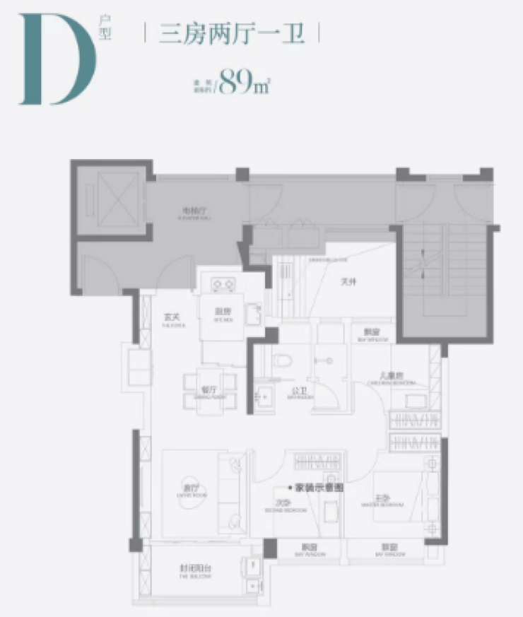 户型创新:项目主力户型为建面约89-102㎡三房,采用“LDKB一体化”设计(客厅、餐厅、厨房、阳台贯通),得房率高达76-79%。以建面约102㎡户型为例,三开间朝南,主卧套房设计,次卧可灵活改造为书房或儿童房,满足二孩家庭需求。
