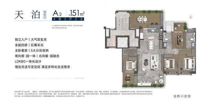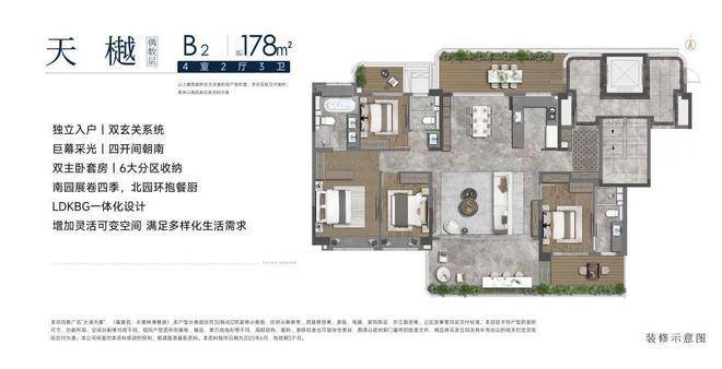洋房B2户型面积约为178平方米,4室2厅3卫,四开间朝南,巨幕采光,南园展现四季美景,北园环抱餐厨空间。