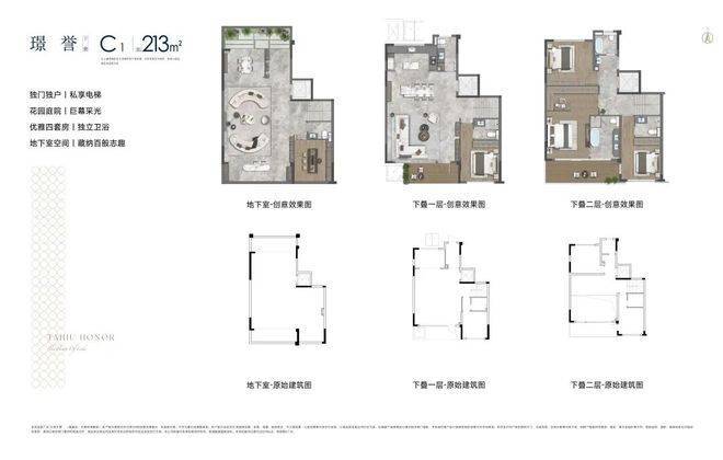 叠墅下叠面积约为213平方米,配备私人电梯,自带花园庭院与地下室,可打造私人宴会厅、家庭影音室、私人酒窖等多功能空间。