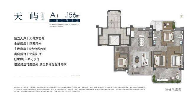 在产品方面,四代洋房A1户型面积约为156平方米,4室2厅2卫,四开间朝南,LDKB一体化设计,全能四房拥有通透采光,南露台与北阳台打造多元化的活动空间。