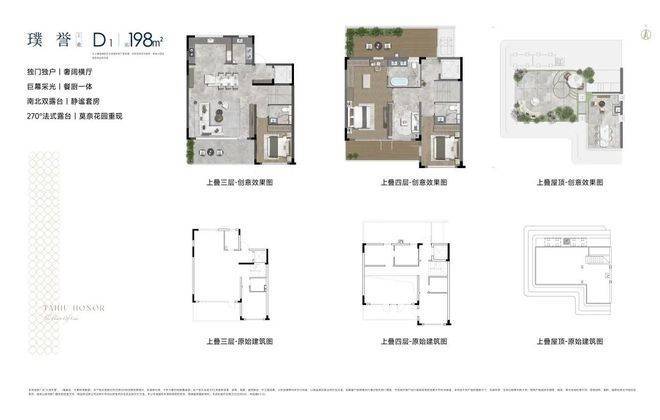 叠墅上叠面积约为198平方米,独门独户,拥有宽敞的横厅,餐厨一体,南北双露台,更有270°法式露台,可打造如莫奈花园般的私人空间。
