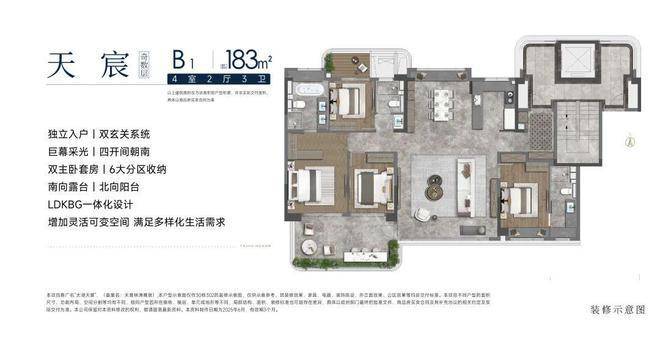洋房B1户型面积约为183平方米,4室2厅3卫,四开间朝南,双主卧套房,六大分区,LDKBG一体化设计,满足多样化的生活需求。
