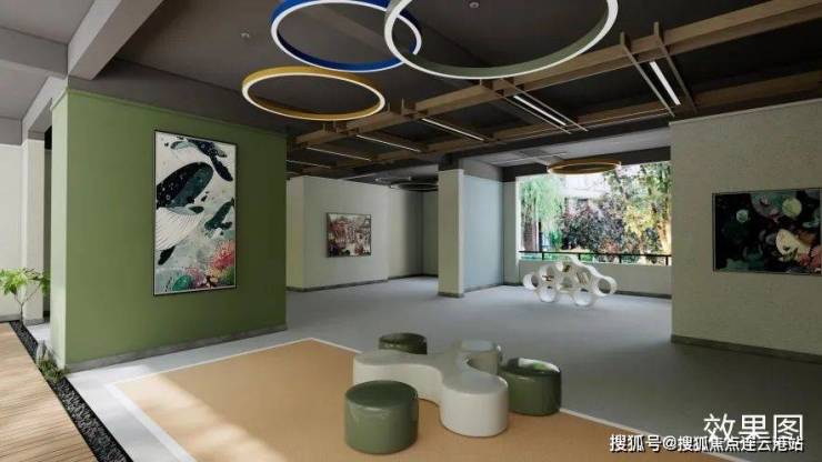 特色架空层:创造性地打通建筑一层,构建架空层。以“自然/流动/公众/情感/品位”为核心概念元素,串联儿童区、健身区、休闲区等多元功能区,打造全龄娱乐休闲生活空间。