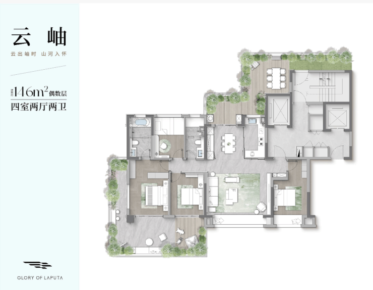 146㎡四房两厅两卫四叶草双套房设计、独立书房高端改善家庭