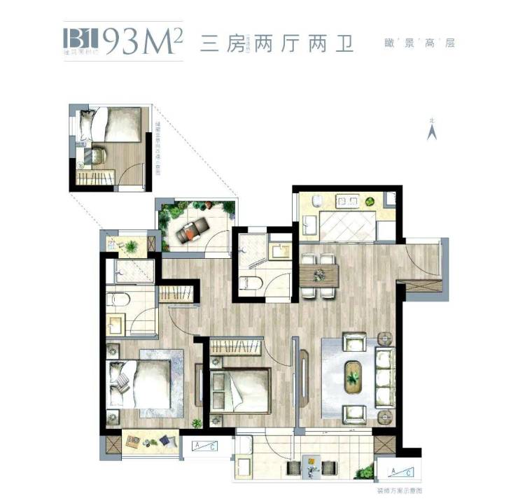 而除了78㎡的三房户型,该楼盘还推出了84㎡和93㎡的两种其他户型。其中,84㎡的三开间朝南设计,配备了约5米的南向双阳台,采光更为充足。其全能三房的布局,相较于78㎡的户型,更增添了一份从容与舒适。