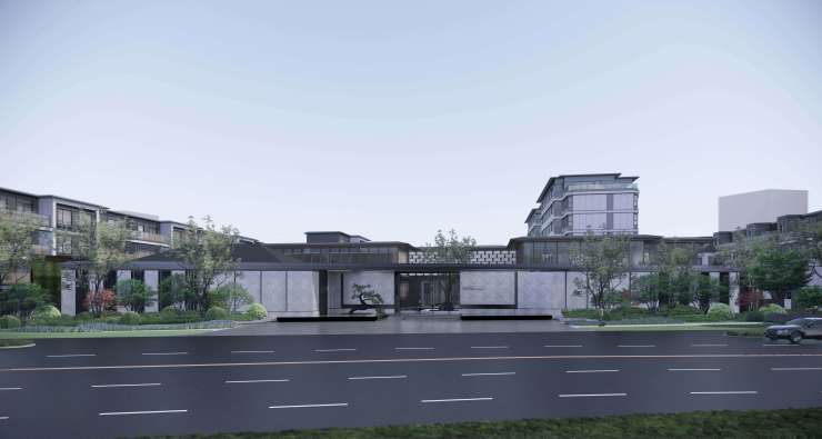 外立面采用灰色铝板+浅灰石材,融合新加坡园林水系