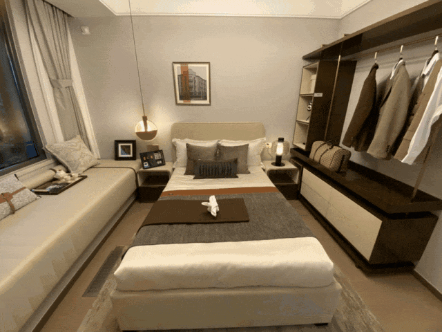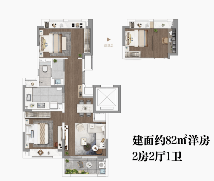 建面约 82㎡的洋房,是 2 房 2 厅 1 卫的全明卫户型,卧室均配置飘窗。餐客阳台一体设计,让空间更开阔,采光更直接良好。北向卧室还可进一步分隔出独立空间,无论是父母养老、新婚夫妻居住,还是有孩子后作为三口之家住所,都能满足需求。