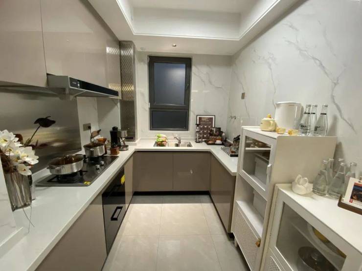 其 U 型厨房预留双开门冰箱位置,操作动线流畅合理。南向长辈房相对独立,起居互不干扰,北向房间可按需改造成儿童房或书房。主卧采用大套房设计,配备大尺度衣帽间和独立卫浴间,空间宽敞舒适。