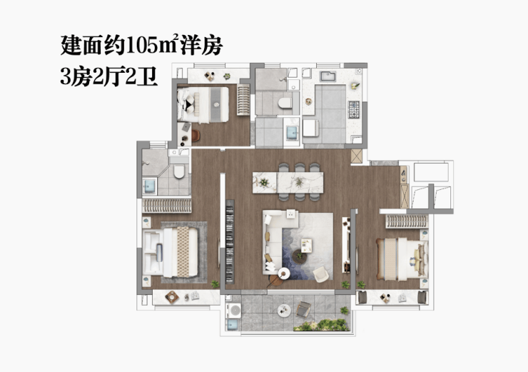 建面约 105㎡的洋房,3 房 2 厅 2 卫,三开间朝南,采用方厅设计,餐客厅形成大型开放性互动空间。各个空间动静分离,起居互不干扰,且没有过道,极大提升空间利用率。