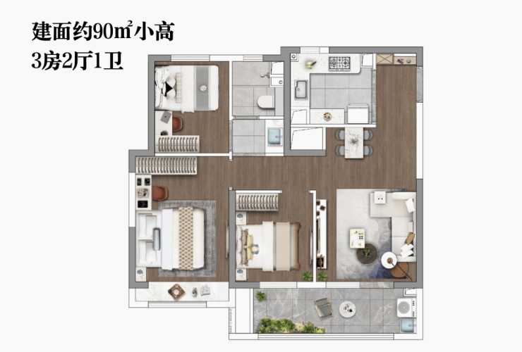 还有建面约 90㎡的小高层,3 房 2 厅 1 卫户型,双联阳台让空间更宽敞通透。南向双卧室,次卧与阳台相连通,北向卧室可灵活改造成书房或者儿童房。