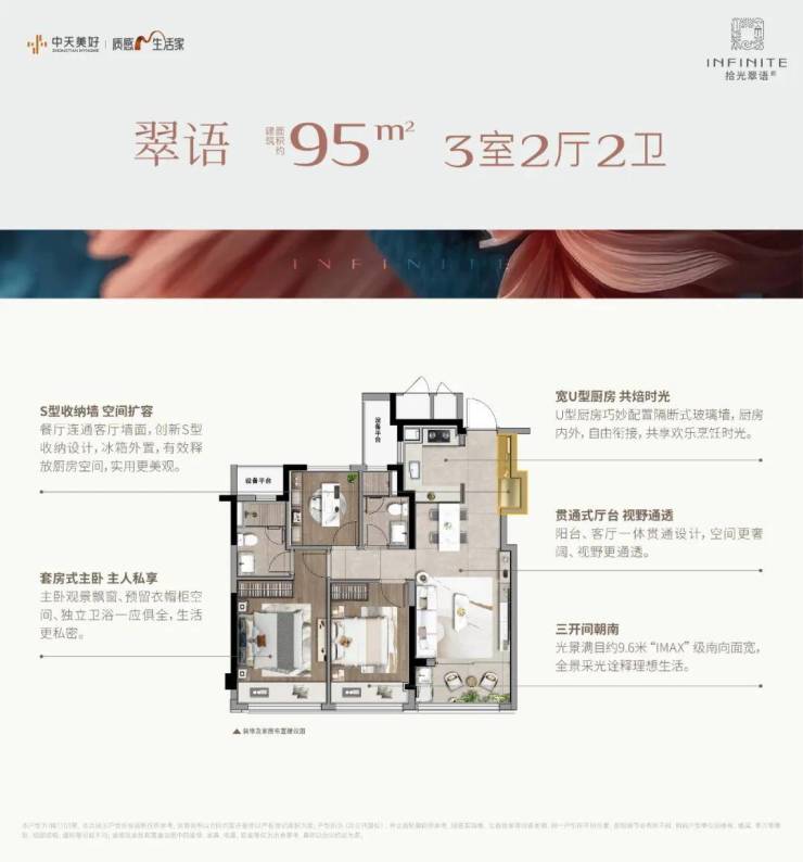 主力户型95–103㎡三室两厅,得房率超90%,比同区域楼盘高3–5%,实用空间更大