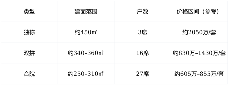 产品类型:全社区仅规划 46席,均为低密中式院落,无高层洋房,纯藏品级产品。