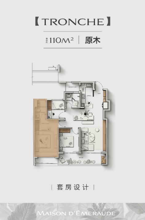 110㎡户型:三房两厅两卫,三房朝南,南向大面宽,适合首改家庭。
